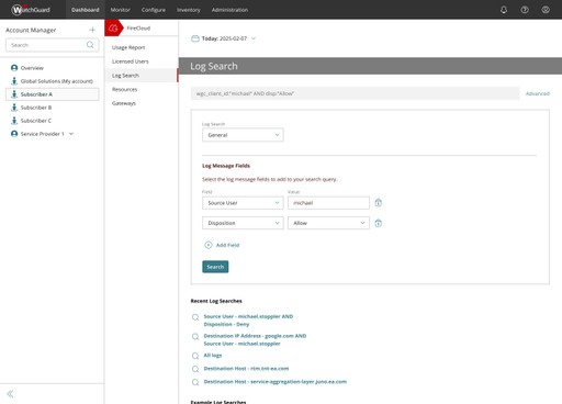 WatchGuard currently has a log search experience to search logs across different devices and services. However, these logs are only accessible via a custom query language that WatchGuard provides. The UI has no mechanism to identify incorrect queries, which leads to customers hoping the query is correct then waiting to see no results returned. When we polled the data, 63% of log searches submitted by customers returned no results due to incorrect syntax. As we designed FireCloud, we wanted to improve this experience so users would have a much higher success rate when searching for logs.