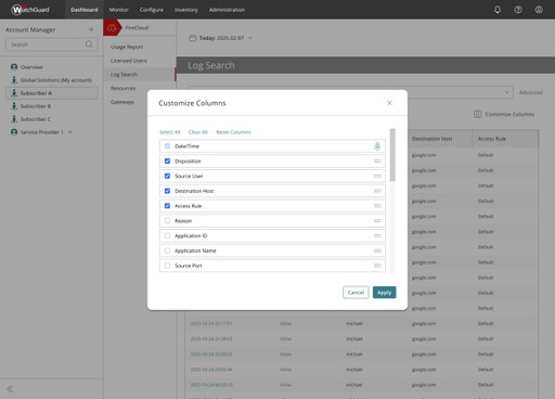 Users can customize which columns they want to see in the logs depending on what they are searching for